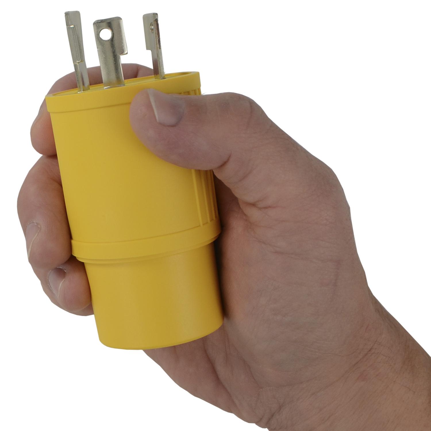 This plug adapter converts a L5-30 outlet into a L5-20 outlet, allowing devices with that plug configuration to receive power. Since this adapter is not waterproof, it is not recommended to use in wet/damp locations.