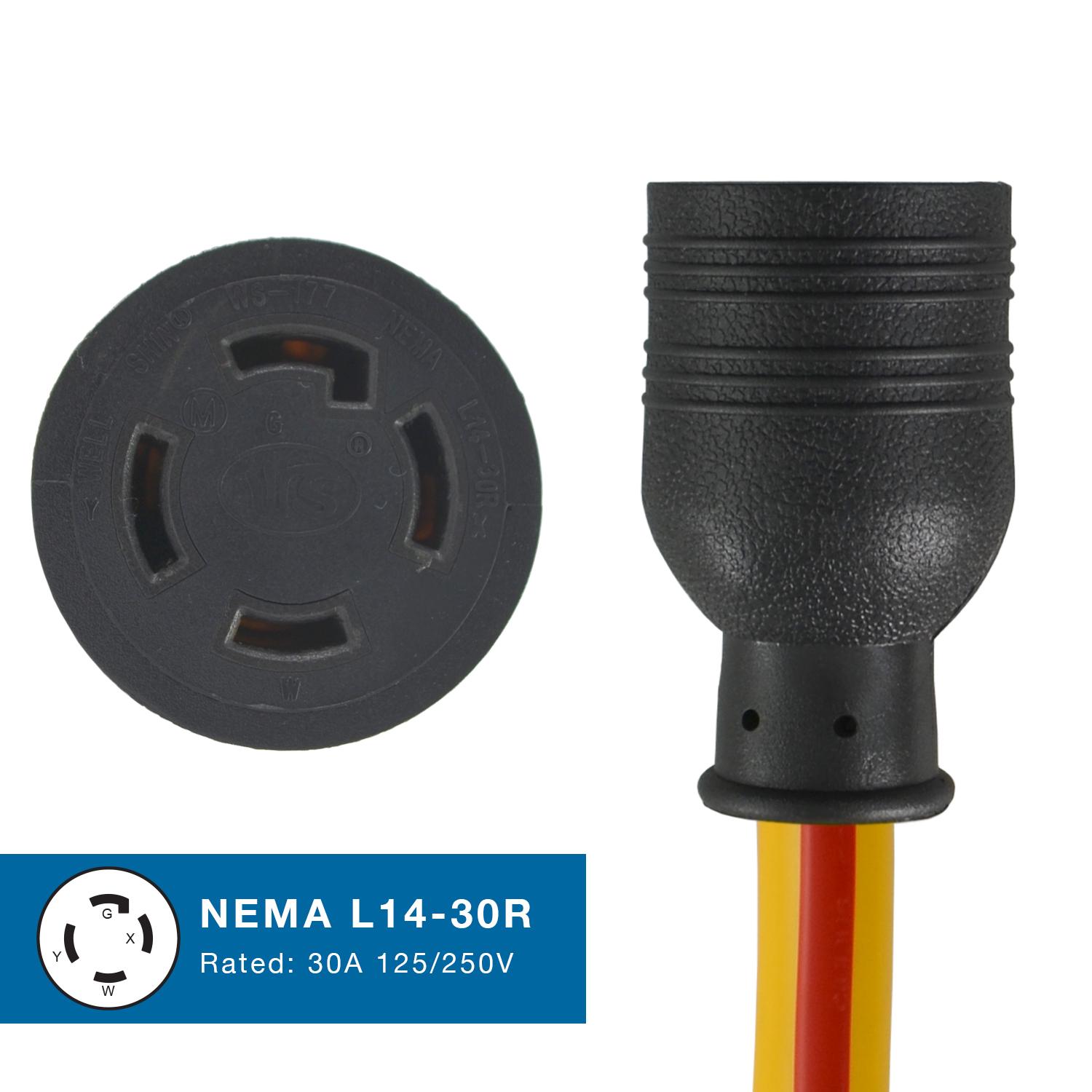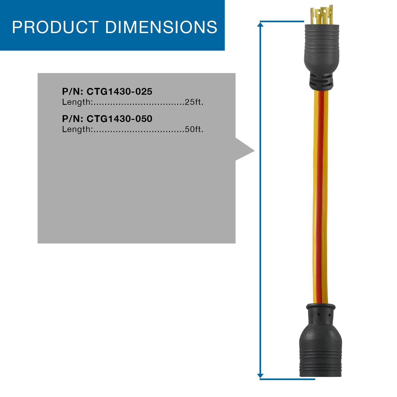 These generator extension cords are designed for harsh outdoor conditions when you need a reliable power connection most. Each cable is manufactured using a solid fill extrusion method to minimize impact from being dragged across rugged surfaces. While staying flexible in cold temperatures, the heavy-duty STW outer jacket is also heat resistant up to 105°C (221°F), making it ideal for various weather conditions. Available in 25ft. and 50ft. lengths, these cords are equipped with NEMA L14-30 ends to plug into a generator’s 4 prong 125/250 volt receptacle.