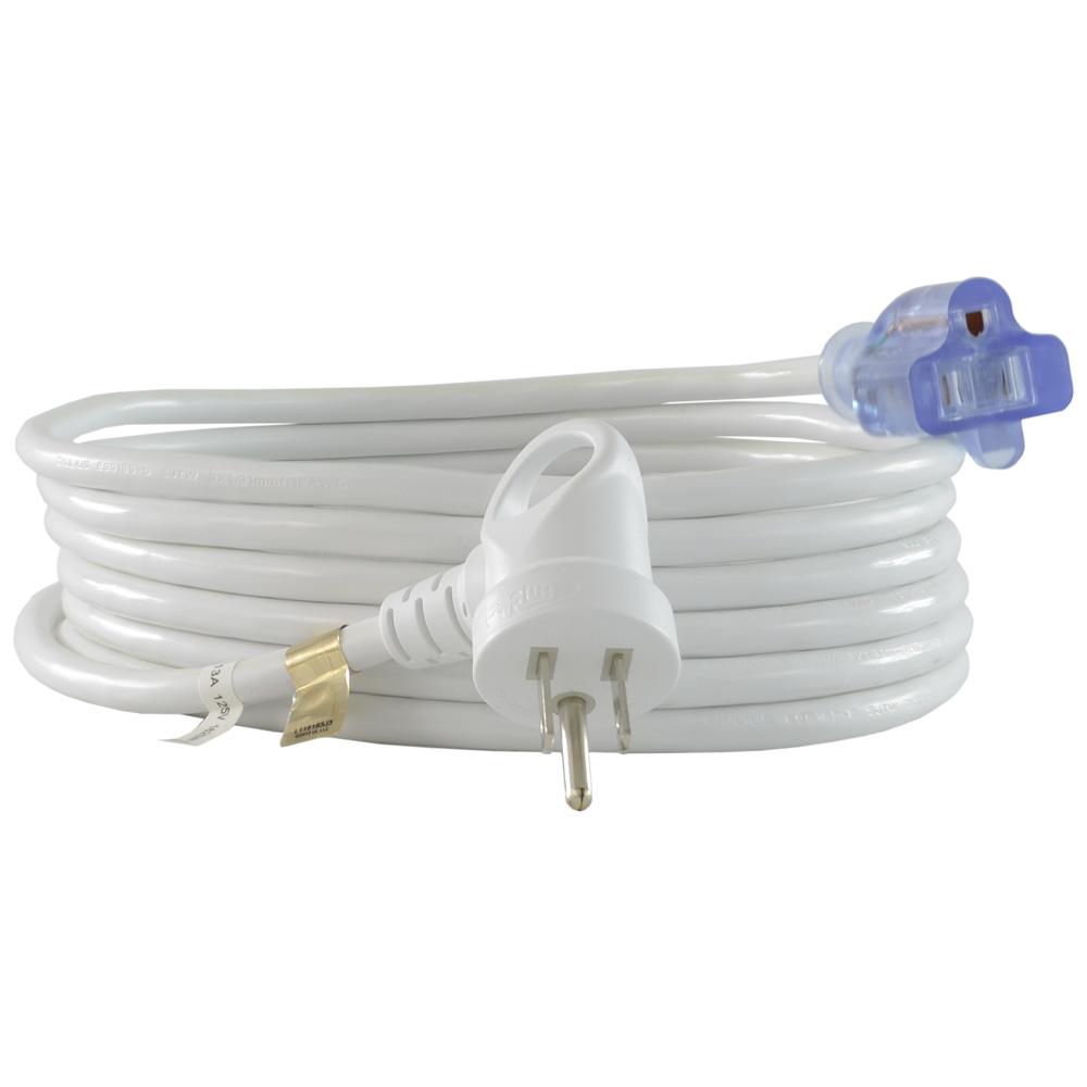 These indoor extension cords are available in several different colors depending on the length. The male plug has an easy finger grip design and plugs in with a right turn to prevent the cord from blocking the outlet beneath it. The female connector is clear blue with a neon light that illuminates when the power is connected.